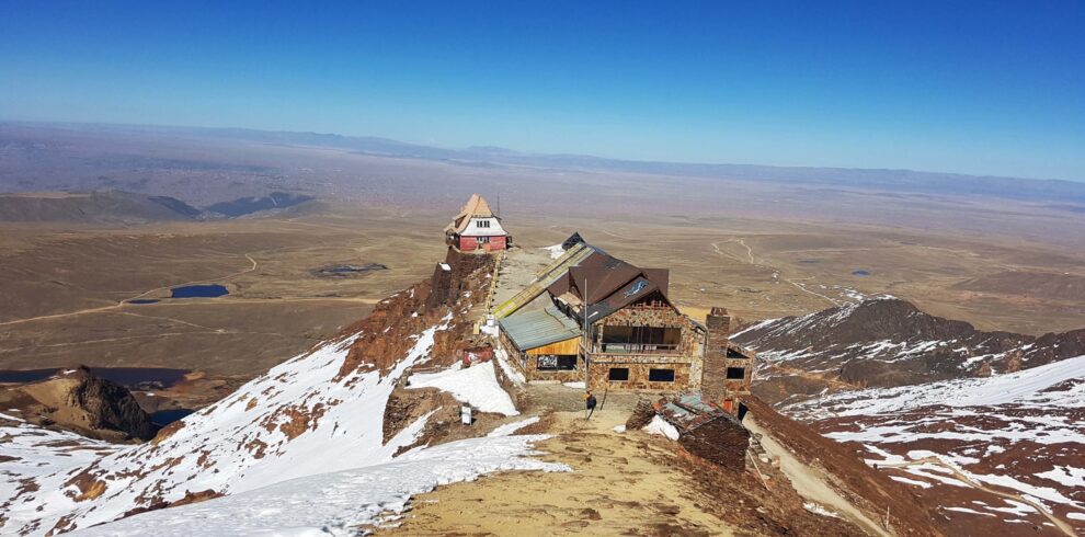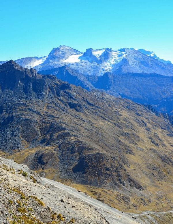 The adventure begins early (pick-up around 7:00–7:30 a.m.) from La Paz, with a drive up to the high pass of La Cumbre (≈ 4,700 m) before setting off.